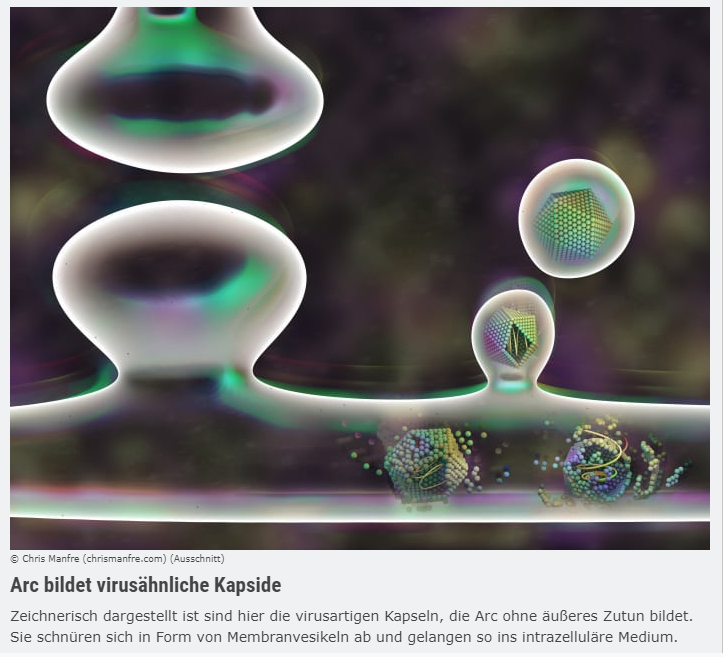 Damit funktioniert Arc fast noch genau so wie ein Virus, das auf diese Weise seinen Wirt überfällt – nur mit dem Unterschied, dass in diesem Fall der Wirt einen Nutzen davonträgt. Welchen, das ist leider immer noch unklar. Als wahrscheinlich dürfte nun gelten, dass das Exvirus mit seiner Transporttätigkeit einen weiteren Kommunikationskanal zwischen den Hirnzellen eröffnet.